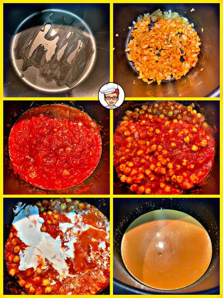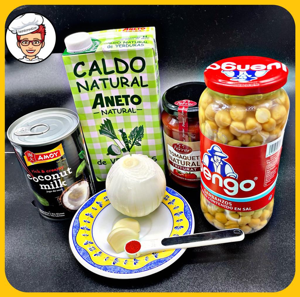 Lo primero que vamos a hacer es cortar la cebolla y el ajo, ponemos un poco de aceite en una olla, añadimos la cebolla y el ajo y dejamos que se haga un poquito y le añadimos una cucharadita de pimentón, removemos y echamos el tomate yo lo he puesto ya triturado dejamos que haga un chup chup y añadimos los garbanzos ya escurridos (recordar reservar unos cuantos para decorar la crema) añadimos la leche de coco, removemos bien y agregamos el caldo de verduras, añadimos sal y pimienta y tapamos la olla, dejamos que cueza durante 20 minutos aproximadamente.