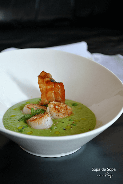 Crema de guisantes a la menta con vieiras y crujiente de Bacon