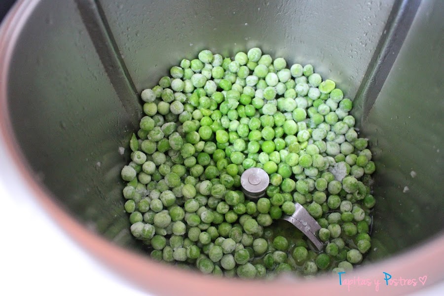 Al acabar añadimos los guisante congelados, el agua, la sal y la pimienta. Programamos 15 minutos, giro inverso, 100º y velocidad cuchara.