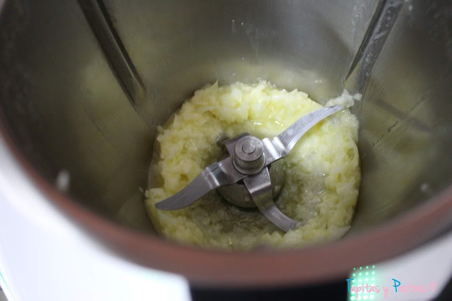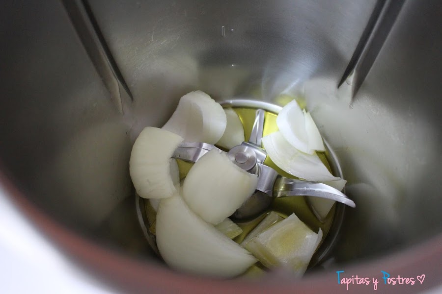 Ponemos la cebolla a cuartos en el vaso de la thermomix con el aceite y troceamos 3 segundos a velocidad 5. Bajamos los restos de las paredes del vaso y programamos 6 minutos, 120º y velocidad 1.
