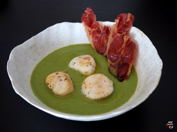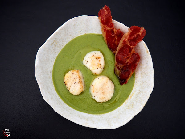 Colocar un cazo de crema de guisantes en el fondo del plato y disponer las vieiras en el centro y las lonchas de jamón. Terminar con un cordón de aceite de oliva.