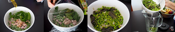 Retirar el film, con cuidado de no quemarse con el vapor, y verter el contenido en un vaso batidor.