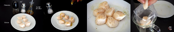 Condimentar las vieiras con sal, pimienta negra recién molida y unas gotas de aceite de oliva. Colocar en una bolsa y envasar al vacío, con máquina u otro sistema alternativo.