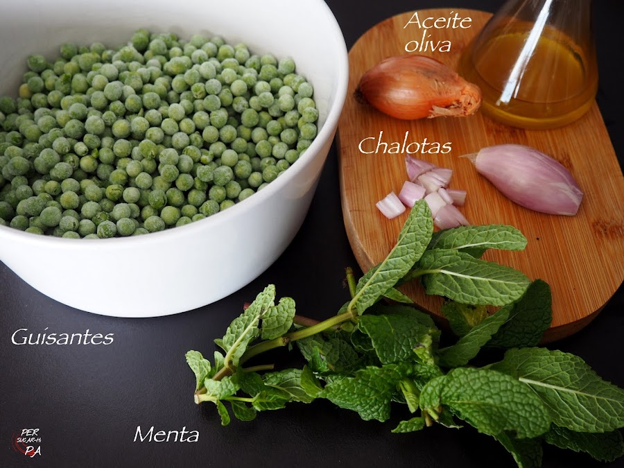 En un bol apto para microondas colocar los guisantes, las chalotas picadas y las hojas de menta fresca. Salpimentar al gusto y añadir tres o cuatro cucharadas de agua. Tapar con film plástico y cocer en el microondas, 4 minutos a máxima potencia.
