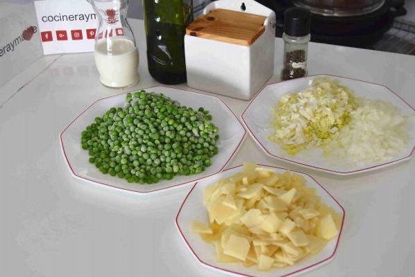 Seguido añadimos los guisantes directamente congelados; mezclamos bien, le añadimos sal y cubrimos con agua o si lo preferís un caldo de verduras.