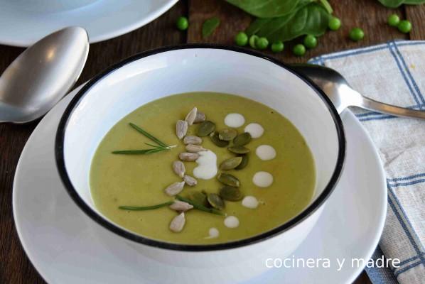 Podéis acompañarla con algo de pan tostado, unos pipas o incluso un poco de jamón. En cualquier caso ya veréis que buena es esta crema de guisantes muy fácil.