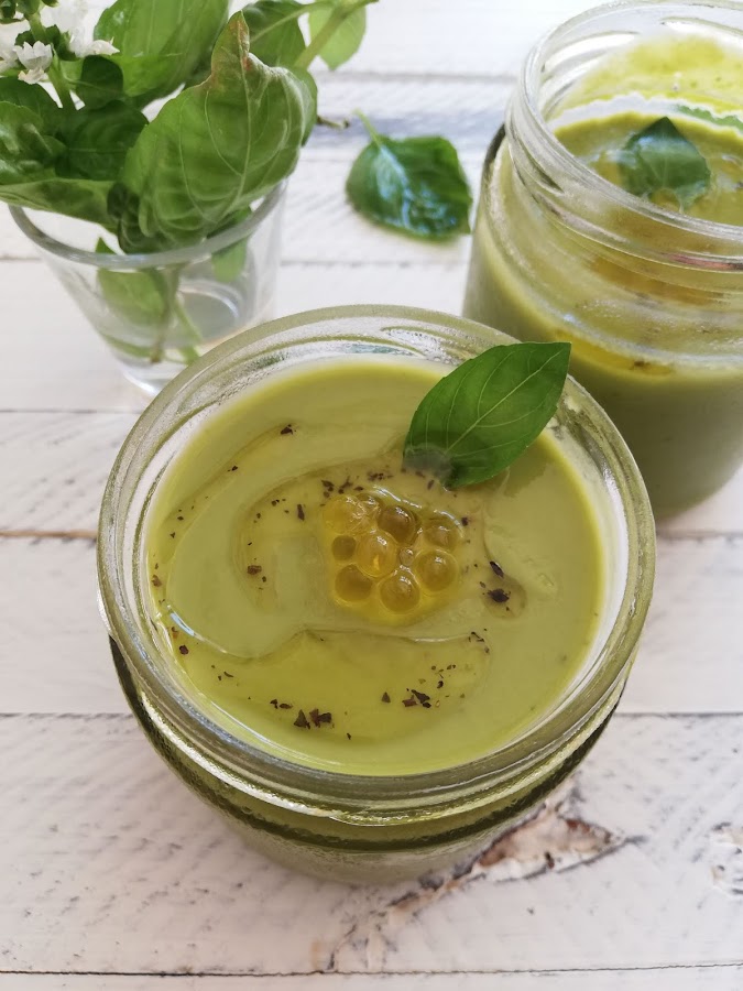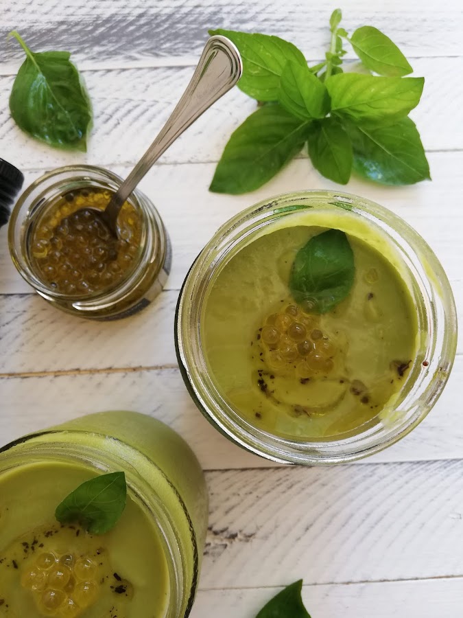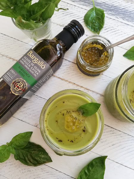 4. Serviremos en boles individuales y los decoraremos con un poco de aceite de albahaca y unas esferas de aceite.