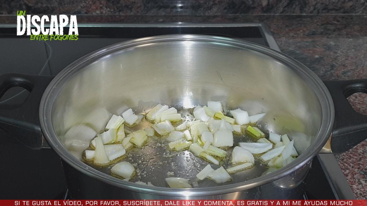 2Cuando el aceite ha cogido temperatura, añadimos la cebolleta troceada, le ponemos una pizca de sal y dejamos que se vaya pochando a fuego medio. No queremos que coja mucho color, solamente que se ablande un poquito.