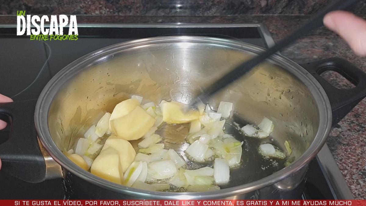 3Mientras se pocha la cebolleta, pelamos una patata y la troceamos en trocitos medianos. Las incorporamos a la cazuela junto con la cebolleta y dejamos que se rehoguen unos 5 minutos.
