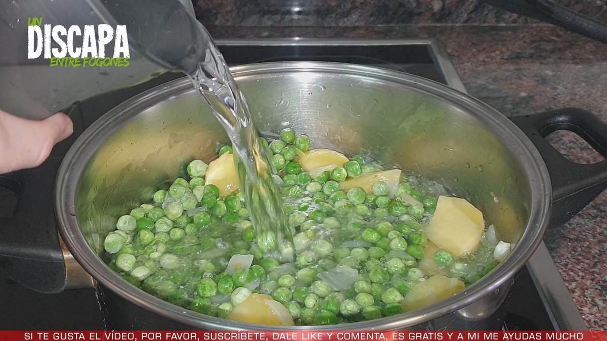 4Pasados unos 5 minutos, añadimos los guisantes, yo voy a utilizar guisantes congelados que son mas baratos y el resultado será igual de bueno. Le damos un par de vueltas. Y cubrimos con agua. Añadimos sal al gusto y le ponemos la tapa. Dejamos unos 15 minutos a fuego medio.