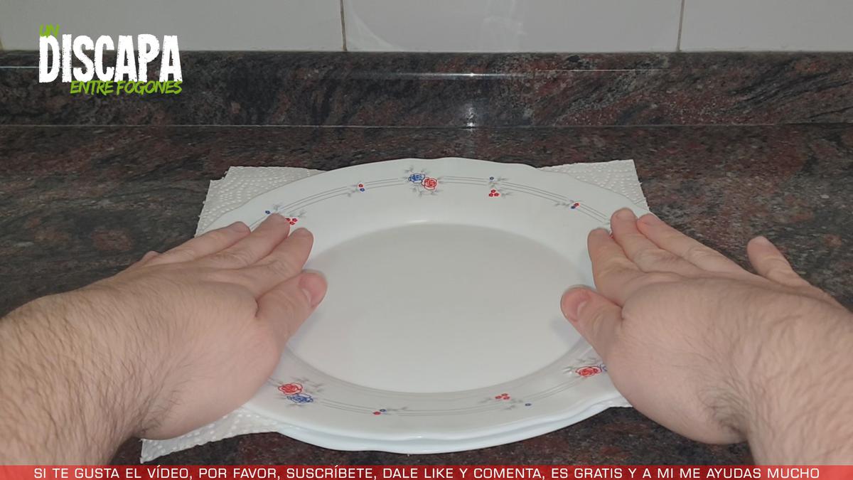 5Mientras tanto, vamos a hacer un crujiente de jamón, para ello, en un plato ponemos un papel de cocina, sobre ese papel ponemos las lonchas de jamón bien extendidas, después ponemos otro papel de cocina encima del jamón y por último, ponemos otro plato encima y hacemos una ligera presión. Después lo metemos en el microondas a máxima potencia durante 2 minutos y medio. A la hora de retirar el plato, tened cuidado porque quema bastante. Retiramos el papel de cocina y vemos como podéis observar, el jamón ha quedado súper crujiente.
