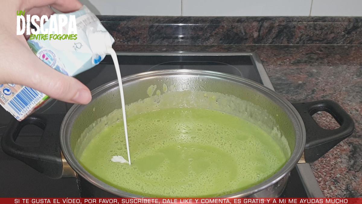 7Una vez triturado, lo llevamos al fuego, le añadimos un chorrito de nata (crema de leche) líquida y dejamos que hierva a fuego lento.