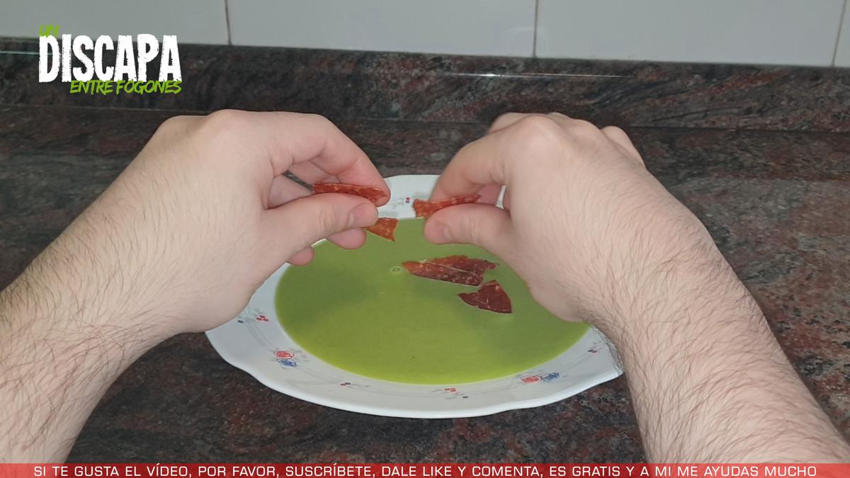 8Por último, servimos y le ponemos el crujiente de jamón por encima.