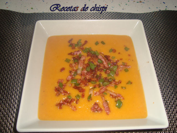 Triturar muy fino y reservar, mientras freimos el bacón hasta que esté churruscadito, añadir el pimiento picado fino, cuando esté frito agregar el ajo picado y las gambas troceadas, terminar de sofreir y servir con la crema.