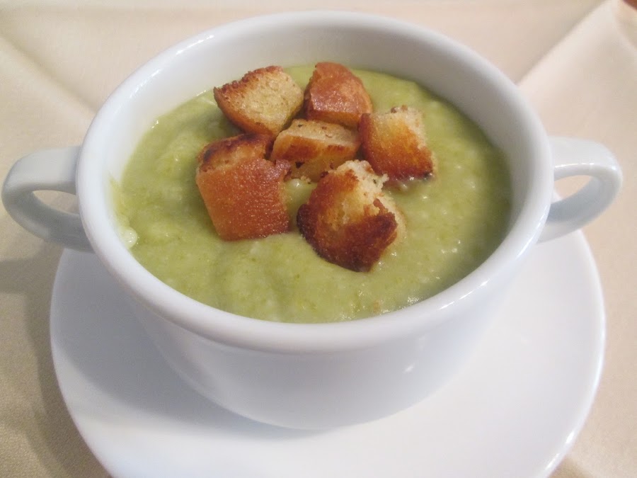 Repartimos la crema caliente en tazas, y en el momento de llevar a la mesa, colocamos por encima el pan frito.