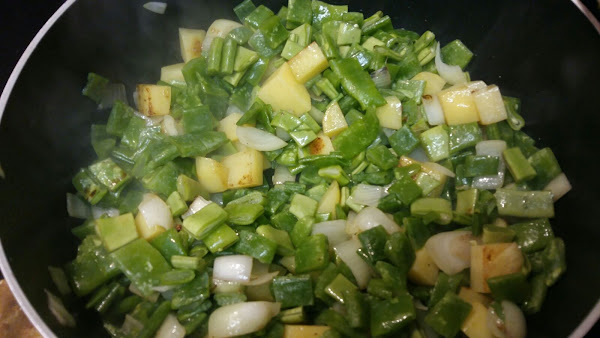 Una vez pochadas echamos las judías verdes y removemos bien.