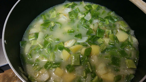 Pasados los 3 minutos añadimos el caldo caliente y hervimos todo 30 minutos.