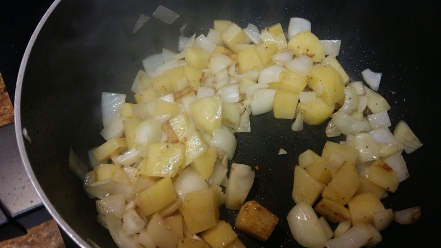 Ponemos una sartén al fuego con 1 cucharada de aceite y sofreímos el jamón.
