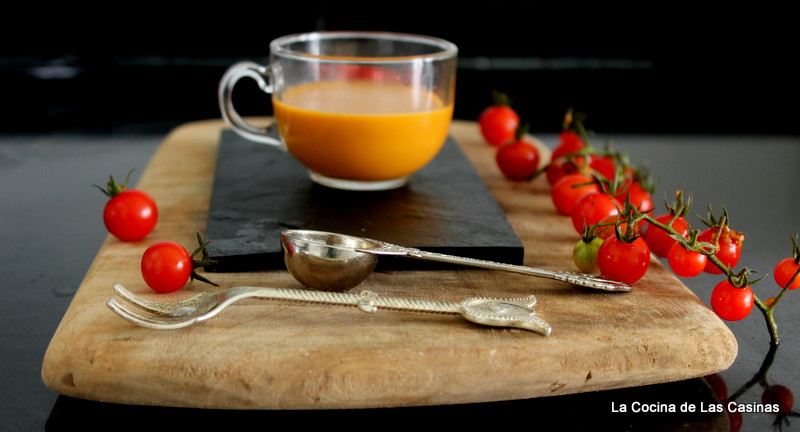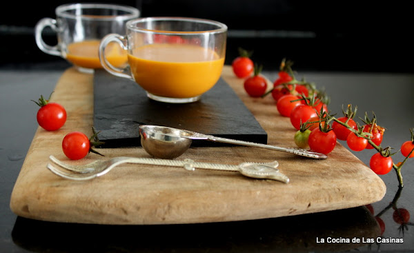 Mientras tanto, introduces en una sartén con un poco de aceite las cabezas de langostinos, obtienes todo el jugo y el sabor exquisito del langostino. Incorporas el brandy y flambeas. Procesas y cuelas con un chino o colador muy fino. Incorporas a la cazuela sde las verdura, añades dos o tres langostinos. Cuando tome sabor, procesas hasta formar una crema de la consistencia que más te guste. Sazonas con sal y pimienta.