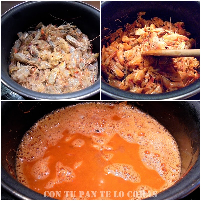 2. En una cazuela sofreír las cabezas y cáscaras de los langostinos en un poco de aceite, durante un par o tres de minutos hasta que cambien de color.