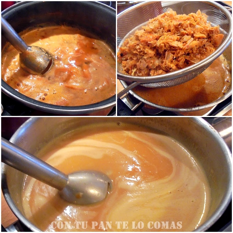 4. En la cazuela del caldo trituramos un poco con la batidora, no hace falta triturarlo todo, es sólo para sacar todo el sabor de las cabezas al colarlo.