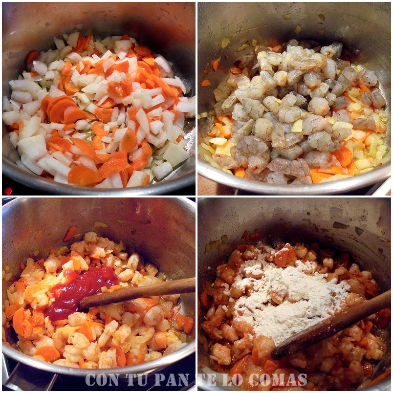 4. En otra cazuela sofreír la cebolla y las zanahorias cortadas finitas para que se hagan antes, y cuando la cebolla transparente incorporaremos las colas de langostinos troceadas. Sazonamos con sal y un poco de pimienta negra y rehogamos hasta que cambien de color.