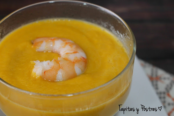 En una sartén con aceite pochamos las zanahorias y el puerro muy picadito. Cuando esté hecho lo pasamos a una cazuela con el fumet y el agua restante y cocemos durante unos 20 minutos. Al acabar añadimos los langostinos y trituramos muy bien hasta que nos quede una crema fina