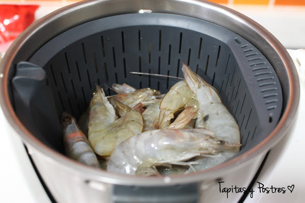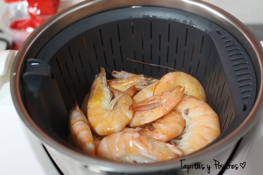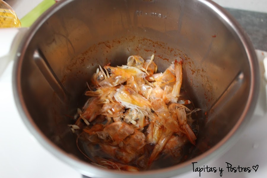Ponemos en el agua de la cocción las cabezas y las cáscaras y trituramos.