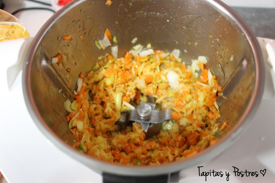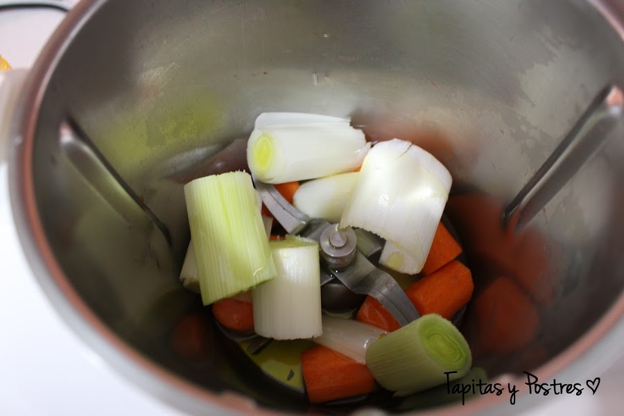 Ahora pelamos y troceamos las zanahorias y el puerro y los picamos en thermomix unos 3 segundos a velocidad 5. Bajamos hacia las cuchillas los restos que haya en las paredes. Añadimos el aceite, sazonamos con una pizca de sal y pimienta y sofreimos 2 minutos, varoma y velocidad 1.