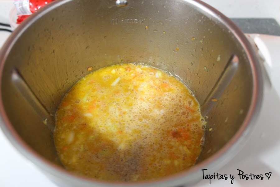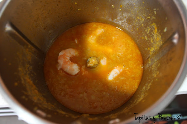 Agregamos el fumet que teníamos reservado y el agua restante (200 ml) y cocinamos 20 minutos, varoma y velocidad 1.