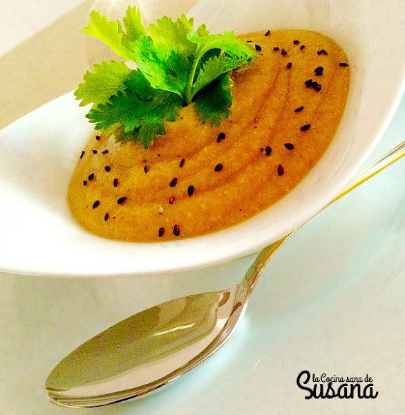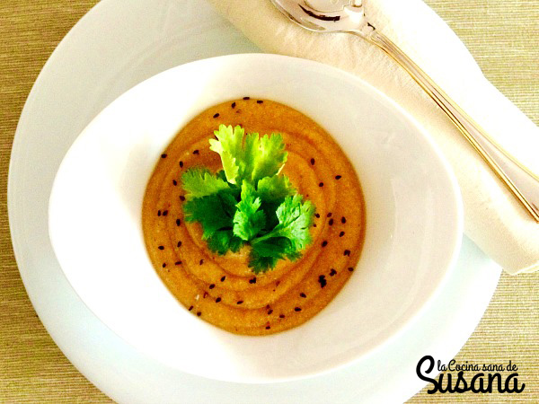 5. Pasado el tiempo y una vez que las lentejas estén blanditas, retiramos el laurel y las cayenas y trituramos todo bien fino hasta obtener una crema homogénea. Rectificamos de sal sio fuera necesario y la servimos caliente con unas hojas de cilantro fresco.Nota: he utilizado unas lentejas sin piel que venden tal cual. Si usas las lentejas normales con piel y quieres que te quede una crema muy fina, pásala por un colador o chino.