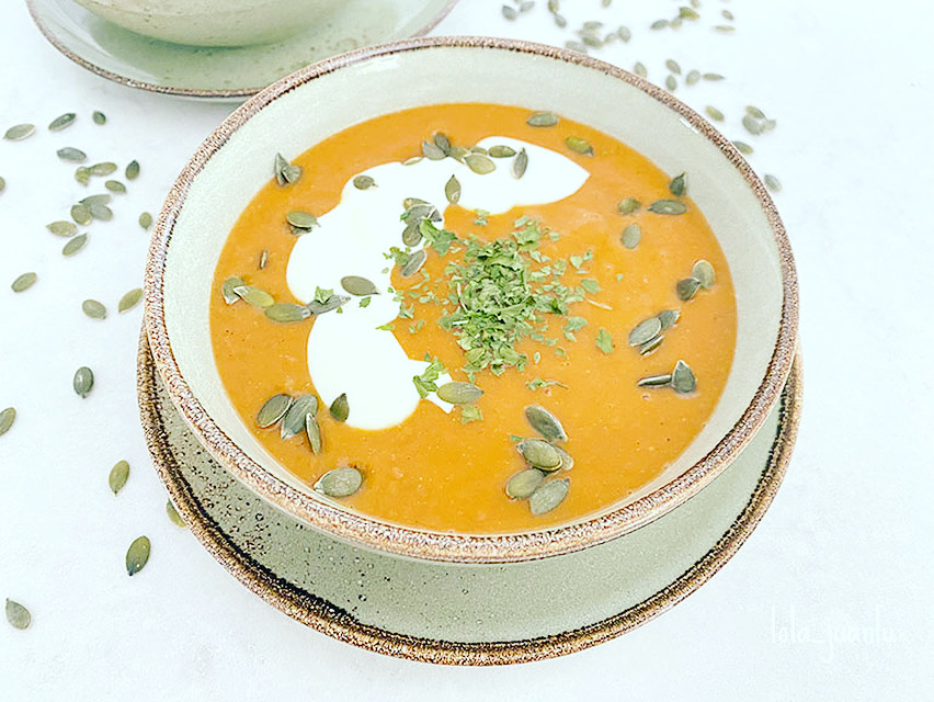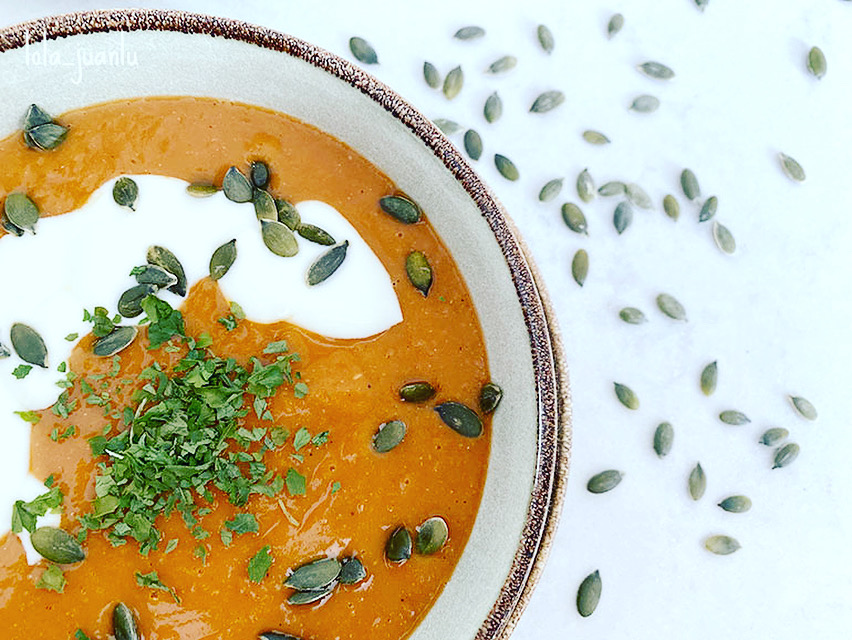 Servimos en cuencos o boles, rociamos un poco de yogur por encima, decoramos con unas semillas de calabaza y espolvoreamos un poco de perejil.