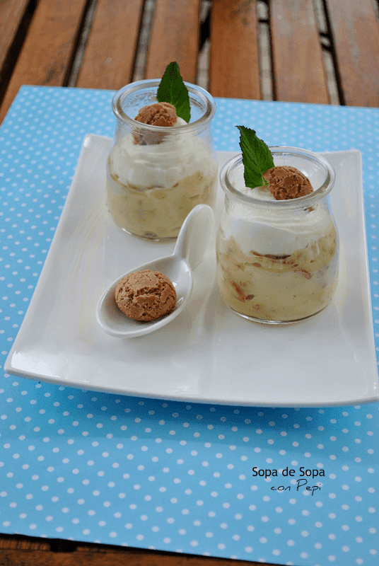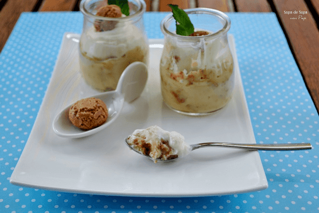 Para servir cubrir la parte de arriba con nata montada (crema de leche), decorar con media galleta Amaretti y una hoja de menta.