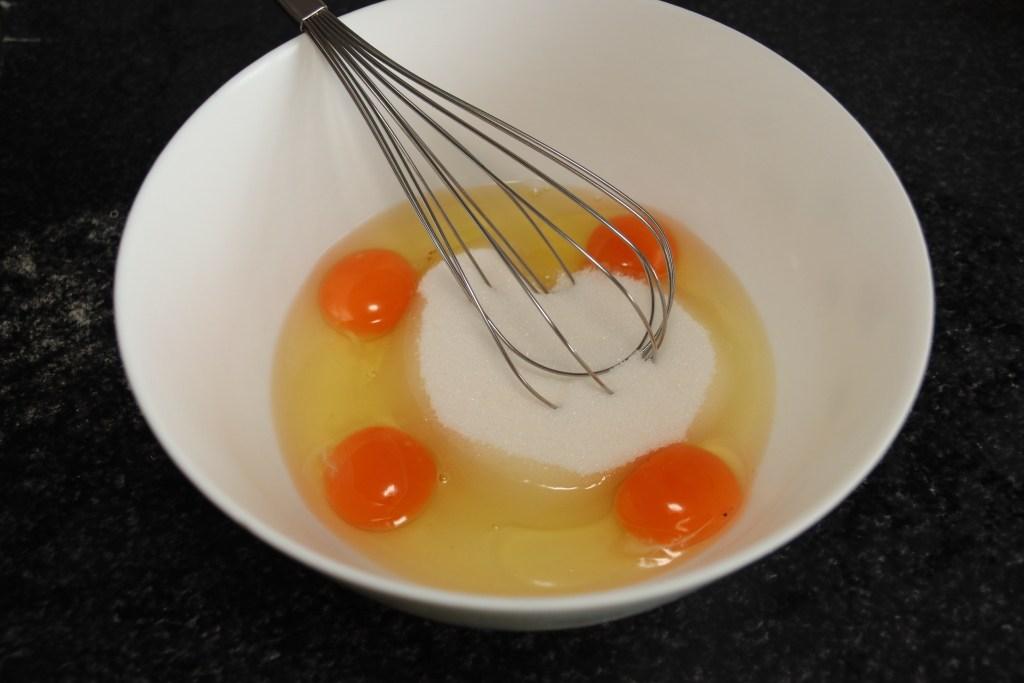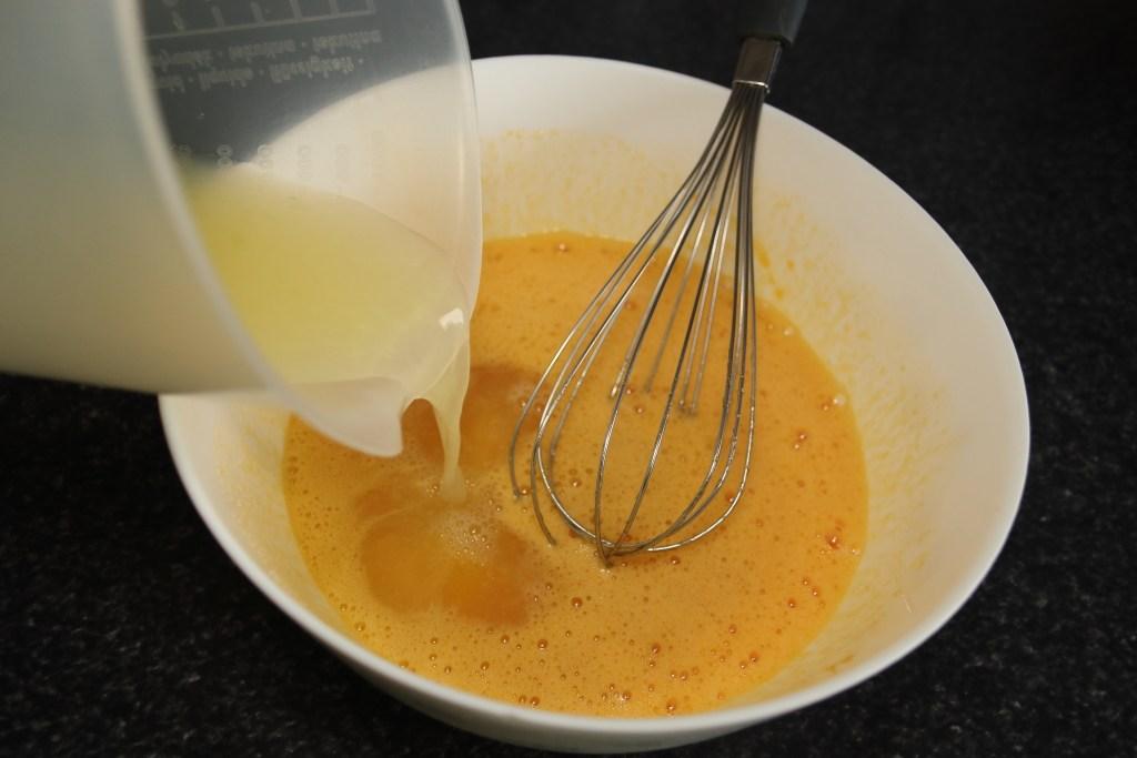 En un bol cascamos los huevos, añadimos el azúcar y batimos con la varilla manual. Incorporamos el zumo de lima y seguimos batiendo.