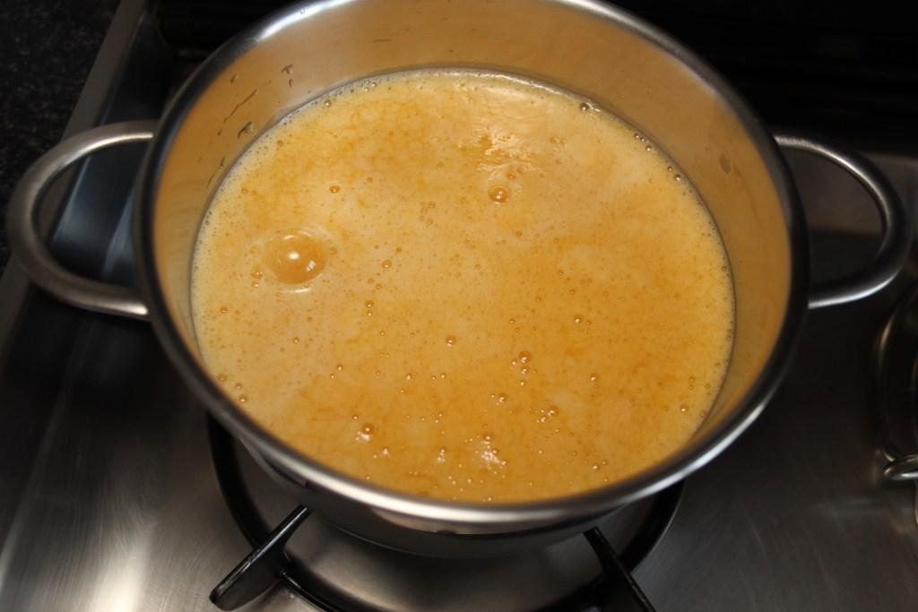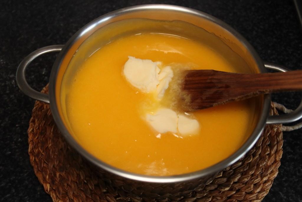 Pasamos la mezcla a una cazuelita y ponemos a calentar a fuego suave y sin dejar de remover hasta que cuaje. Llevamos a ebullición y retiramos del fuego. Añadimos la mantequilla poco a poco y en trozos, removemos bien hasta que se funda.