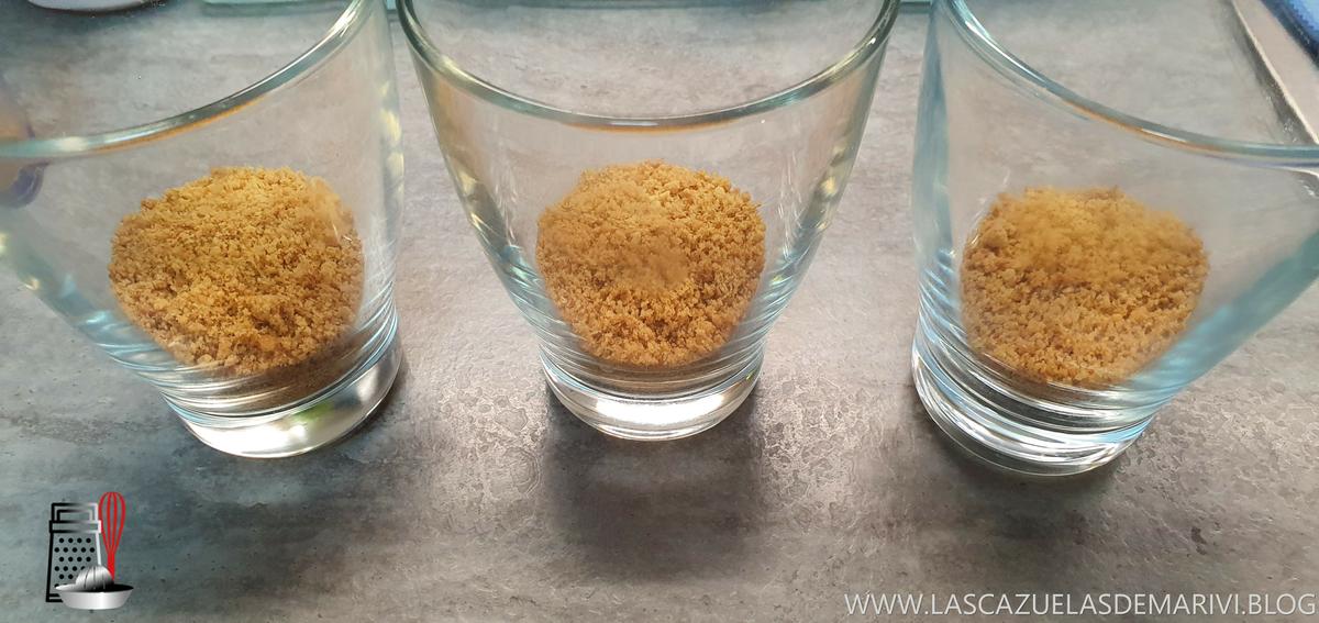 A esas arena de galletas le añadimos la mantequilla derretida, lo mezclamos bien y ponemos una capa en cada vasito.