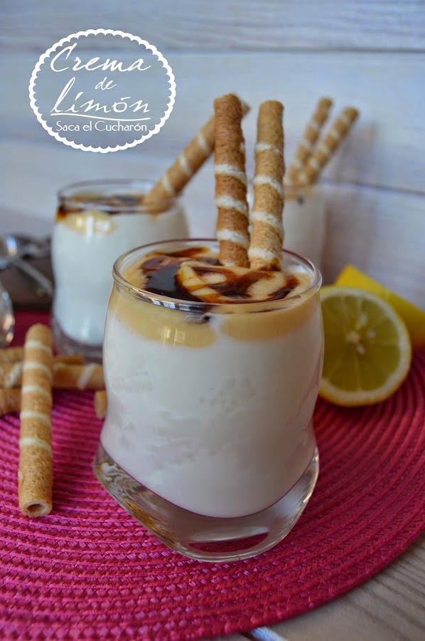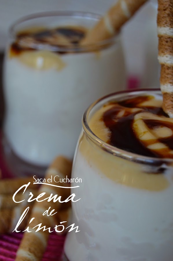 En vasos o copas de postre, repartimos la crema de yogur fría y a continuación, añadimos una capa de crema de limón. Por último, adornamos con sirope de caramelo y un canutillo.