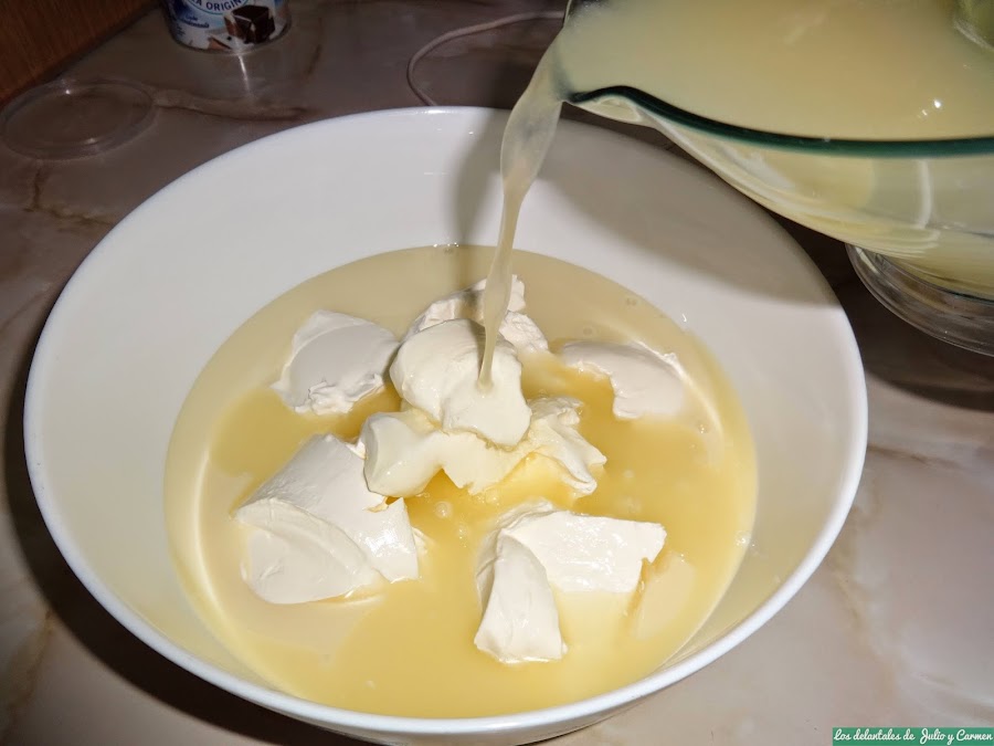En un bol, vertemos la leche condensada junto con el queso y el zumo de los limones que teníamos reservamos.