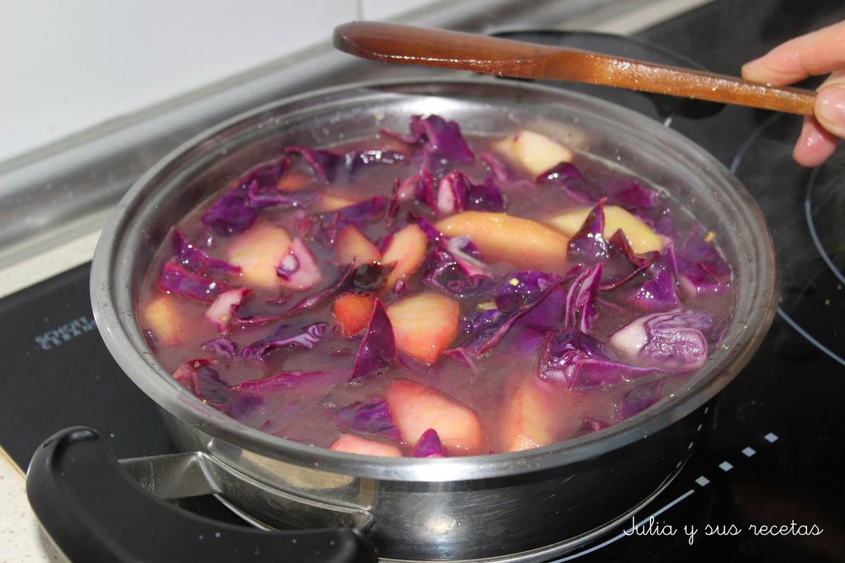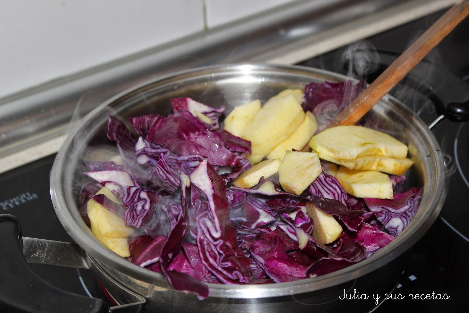 En una cazuela ponemos la mantequilla y un poquito de aceite de oliva y sofreímos el ajo picado. Añadimos la lombarda y la manzana y las sofreímos.