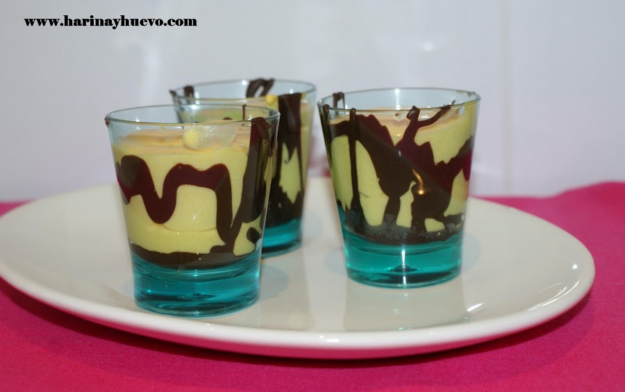 Os pongo también unas fotos donde os doy otra idea para presentarlo, con lo que me sobró hice unos chupitos de crema de mango. Puse un poco de chocolate en los bordes y en el fondo. Ideal para cuando te apetece algo dulce después de comer pero ya estás lleno.