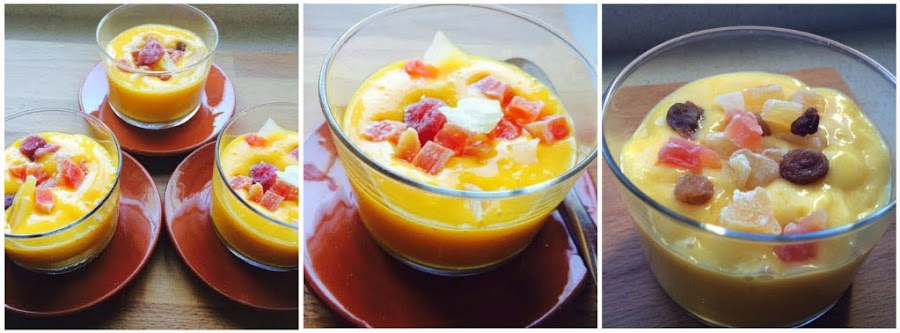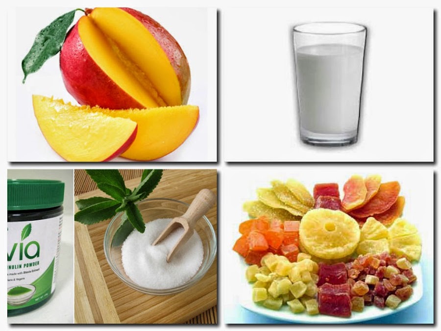 Es tan fácil como pelar los mangos y cortar . Los ponemos en la batidora o Thermomix con el azúcar o Stevia. Batimos y añadimos la leche, batimos un poco mas y lo ponemos en vasitos, copas o donde nos guste mas, adornamos con la frutas deshidratas cortada en cuadritos. Meter en la nevera hasta el momento de servir. ¡Y listo!