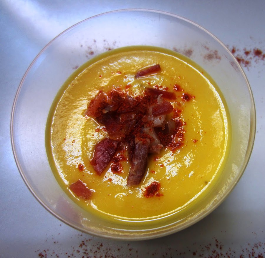 CREMA DE MANZANAS CON PUERROS Y ZANAHORIA Y PICADA DE JAMÓN