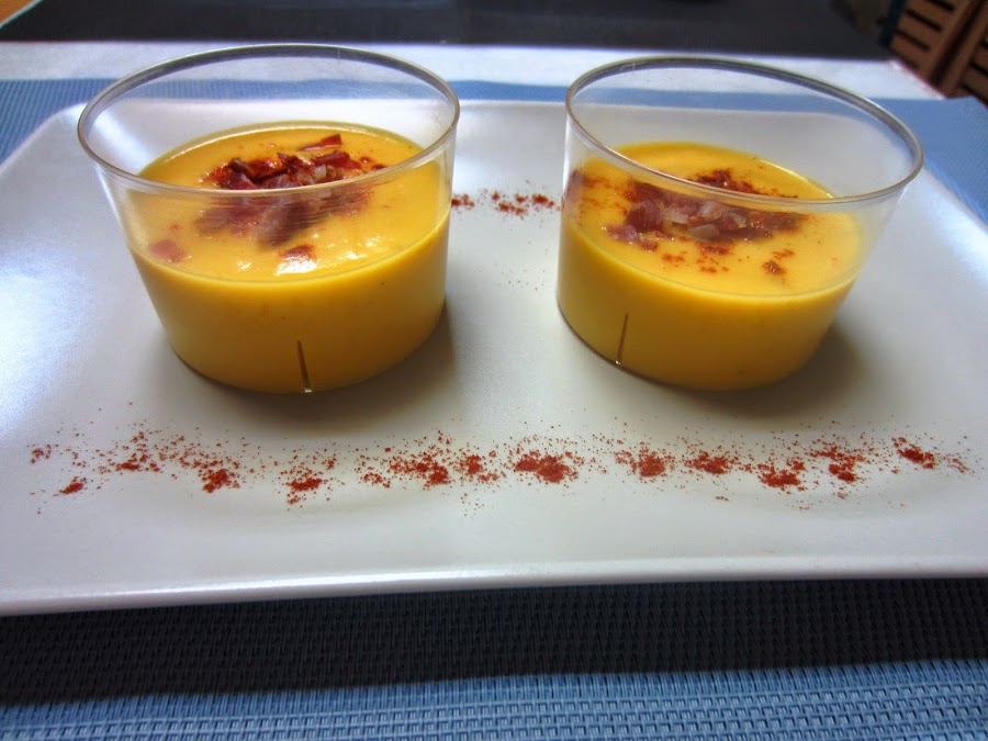 Ponemos la crema en chupitos o en bol de presentación y repartimos el jamón sobre ellos.