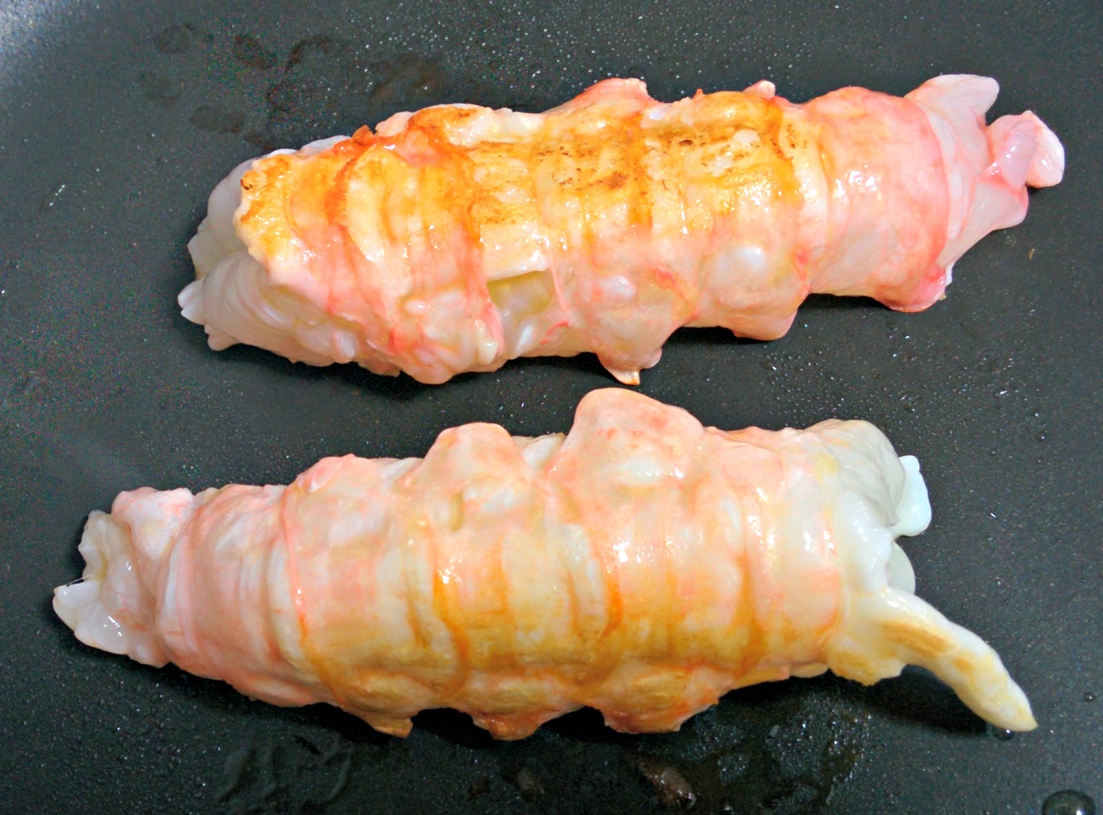 5.- Ahora todo se acelera, en una plancha muy caliente vamos a pasar las colas de las cigalas un poco untadas en aceite de oliva virgen extra (el aceite en la cigala, no en la plancha), No las paséis mucho, que queden un poco doradas por fuera jugosas por dentro, el calor residual y el de la crema terminará por cocinarlas.