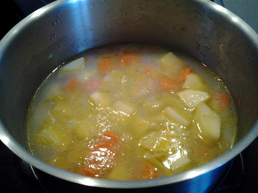 Cuando está el sofrito se añaden las patatas troceadas, el caldo de la cocción de los mejillones y cocer hasta que la patata esté blanda a fuego lento (unos 20 minutos).