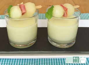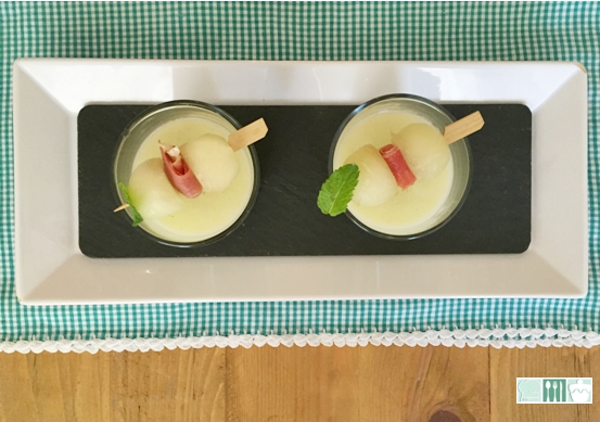 Servir muy frío. En esta ocasión con un saca bolas, pinche unas bolas de melón con un trozo de jamón serrano entre de cada bola.* Si queréis hacer un crujiente de jamón en este enlace os expliqué como hacerlo.