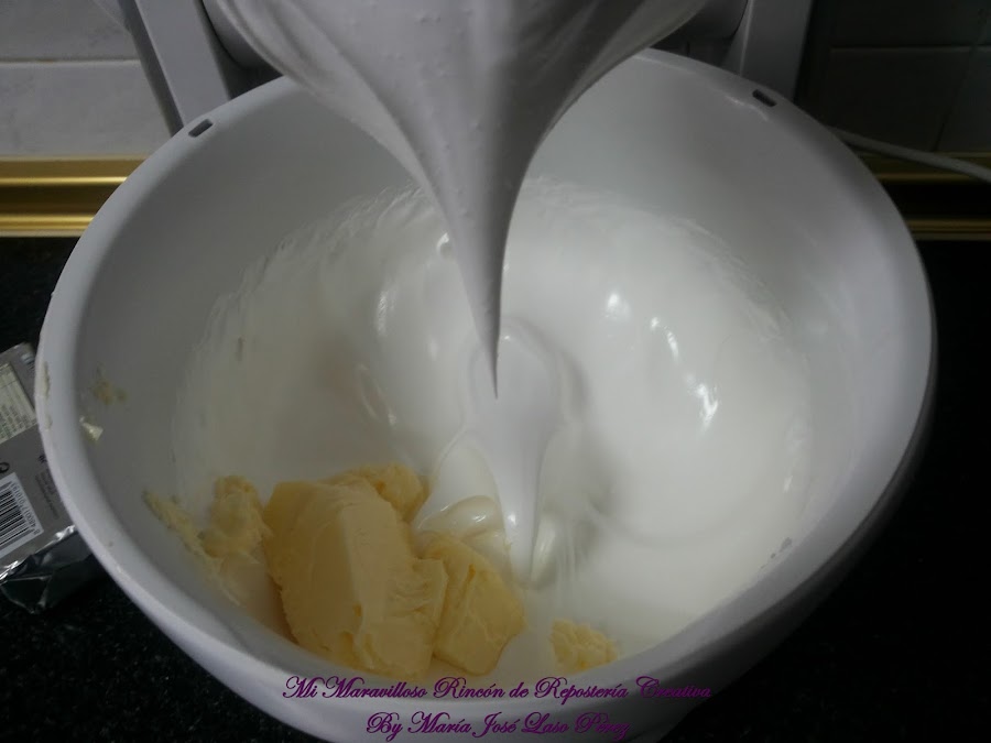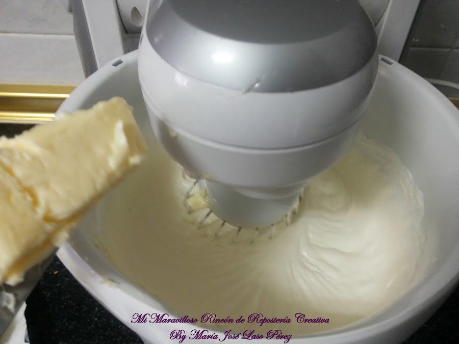 Llegados a este punto añadiremos la mantequilla que tenemos a temperatura ambiente (punto pomada) en trocitos, sin dejar de batir, pero a velocidad baja, para que se vaya integrando bien. Rasparemos con una espátula las paredes del bol, ya que la mantequilla se queda pegada y así ayudaremos a que se mezcle bien.