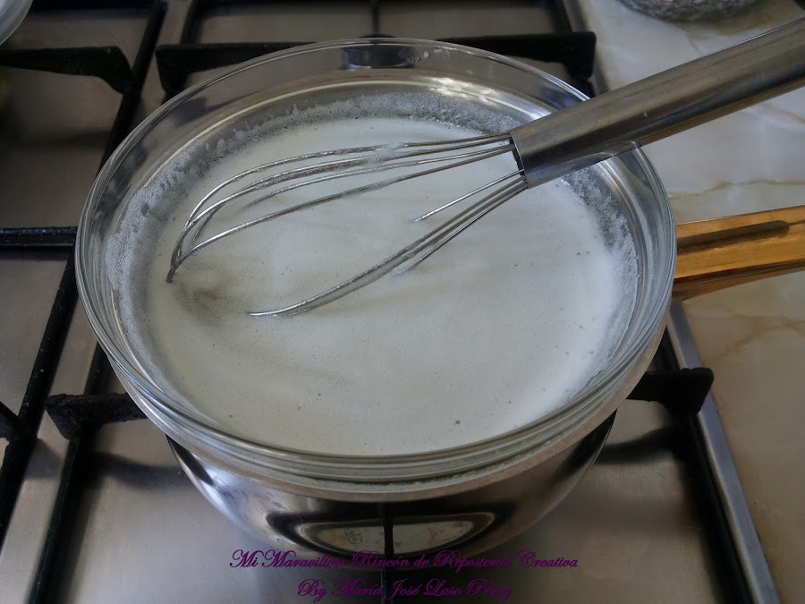 Colocamos un recipiente al Baño María a temperatura media, evitando que hierva, y en él ponemos nuestro bol con las claras y el azúcar. Removemos con unas varillas manuales hasta que se disuelva.