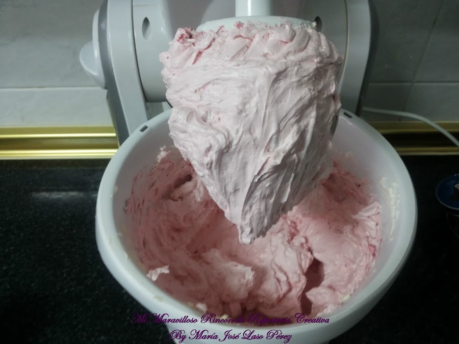 Es en este momento cuando podemos añadir nuestra esencia con el sabor preferido, yo he elegido para esta ocasión la frambuesa en pasta, que es muy concentrada y queda estupenda.