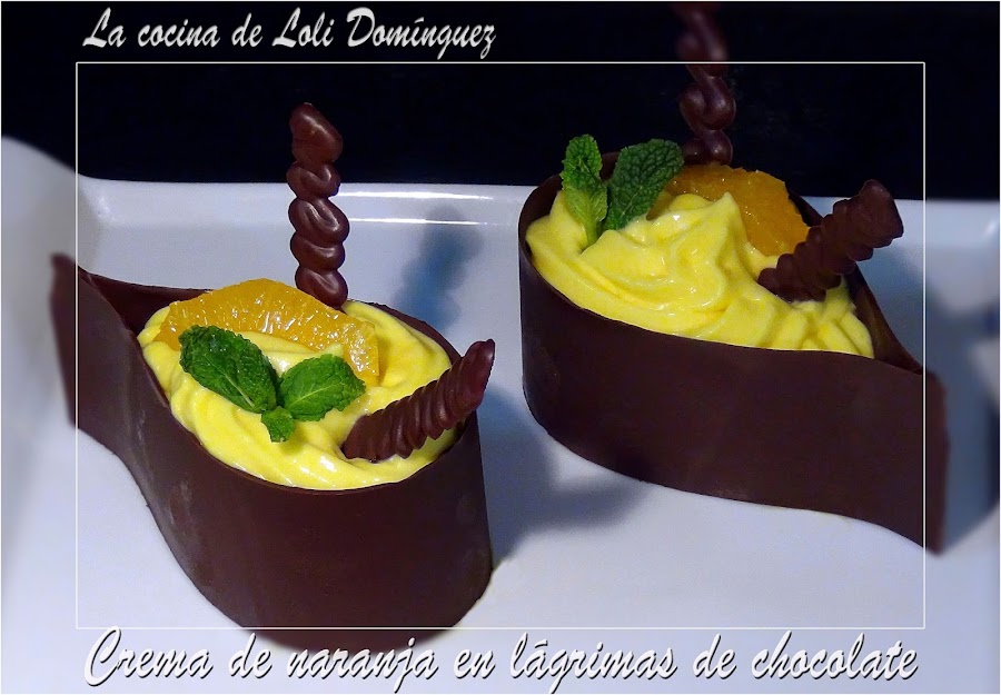 Montamos el postre justo antes de servir: ponemos la crema en una manga pastelera con boquilla rizada y rellenamos cada lagrima que ya tendremos en el plato de servir, repartiendo la crema por todo el interior de cada lagrima de chocolate y decorándola con un gajo de naranja y las decoraciones de chocolate que tenemos preparadas, también le podemos poner una hojita de menta, le retiramos el papel de acetato en el último momento y servimos. Probadlo os va a encantar.